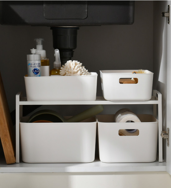 地柜位置低又潮濕,適合放些比較重的東西和大件物品,比如大瓶裝的清潔劑、洗衣液、水盆等。有些地柜沒有多層抽屜,柜門一打開就是排水管,儲(chǔ)物空間很不規(guī)整。想要充分利用空間,就把收納盒安排上吧。利用收納盒進(jìn)行分類收納,至少可以放幾十件小東西,搭配分層置物架,地柜空間就能實(shí)現(xiàn)物盡其用。