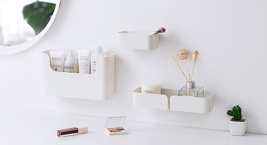 小戶型衛(wèi)浴間里的浴室柜往往臺(tái)面小,整個(gè)臺(tái)面幾乎被臺(tái)盆占滿了。收納空間幾乎為0,只能放洗手液、香薰等。但也別擔(dān)心,墻面裝上免打孔置物盒就能輕松搞定,既不損傷墻面,又能增加收納空間,即便是洗漱用品再多,也不怕無處可放。